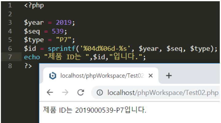 변수 3개를 형식화해서 문자열로 조합해줍니다. 그문자열을 변수 $id에 대입하고 echo를 통해 출력해보았습니다.