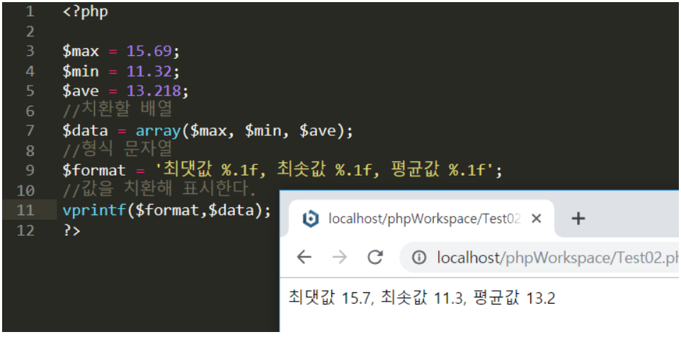 : 문자열 안에 치환할 값이 여러개 있을때 printf()대신 vprintf()를 사용하면 치환할 값을 배열로 지정할 수 있습니다.