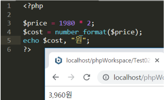 $price 변수에 값을 곱해서 대입해줍니다. number_format함수를 통해 그값을 파라미터로 전달하고 $cost변수로 받아줍니다.